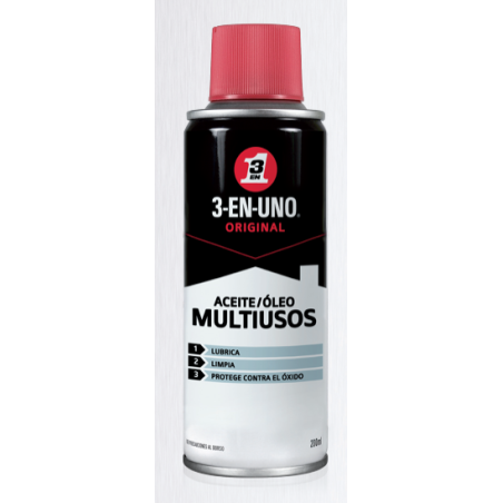 3-EN-UNO ORIGINAL Aerosol es el famoso y auténtico aceite multiusos que sirve para todo. Su fórmula a base de aceite mineral lubrica eficazmente los mecanismos, elimina los chirridos, limpia el metal y protege contra el óxido y la corrosión.