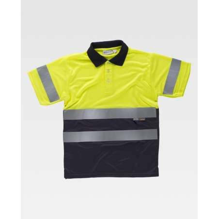 Polo combinado de manga corta en poliéster ojo de perdiz con cintas reflectantes. Parte superior de alta visibilidad. Cuello clásico con tapeta de tres botones y cubrecosturas interior. Aberturas laterales. Una cinta reflectante en mangas y dos en pecho y espalda. Tejido fresco y ligero de alta permeabilidad al aire. Transpirable, de fácil secado y resistente al encogimiento. Cuello en punto canalé.
