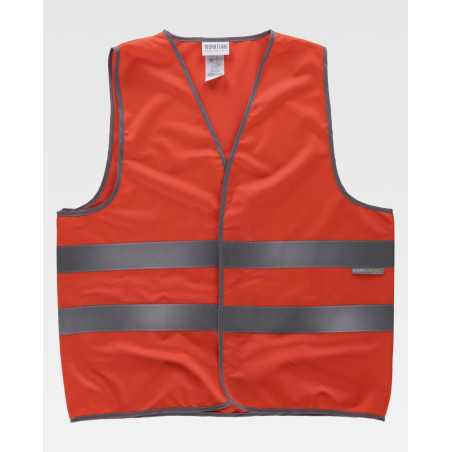 Chaleco de alta visibilidad con cintas reflectantes. Escote a pico y cierre de velcro adaptable. Dos cintas reflectantes en pecho y espalda. Ribeteado con bies a contraste.