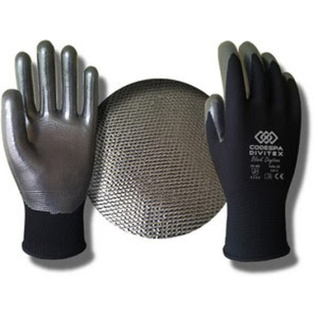 ComposiciónTejido negro de poliéster en galga 13. Nitrilo (NBR) color negro brillo en la palma.