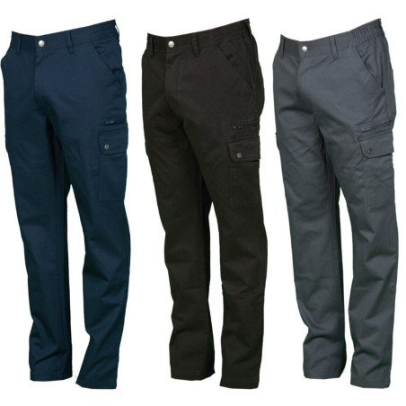 Pantalón para hombre, stretch, multiestación, con elásticos laterales y trabillas en la cintura, cierre con cremallera y botón de metal, dos bolsillos delanteros de corte clásico, dos bolsillos laterales con tapeta y botones a presión, un bolsillo con cremallera de seguridad en la parte izquierda, un soporte para metro retráctil a la derecha, dos bolsillos traseros de ribete con ojal y botón.