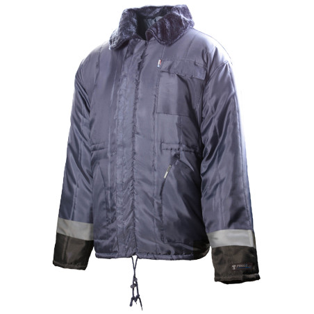 Chaquetón para uso en cámaras frigoríficas (hasta -30ºC.). Cierre cen-tral por cremallera con tapeta de protección. Cuello interior térmico de pelo sintético y cierre ajustable con tira de velcro. Dos bolsillos de plastón abiertos y uno en pecho con tapeta. Acolchado interior cosido rombo con fibra térmica de poliéster. Bandas reflectantes perimetrales en mangas. Cordón de ajuste inferior.